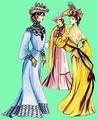 Платье дамы слева выполнено в "греческом" стиле: лиф свободный, высокий, укрепленный китовым усом ворот, грудь пышная, талия очень узкая, бедра широкие, длинная струящаяся юбка.