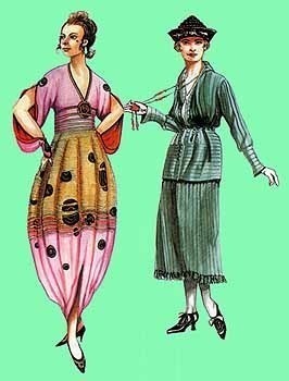 Шелковое вечернее платье-"бочонок" (слева), разработанное Эрге (Ромен де Тиртоф), доходит до щиколотки, а разрез посередине - почти до колена. Верхняя часть, включая рукава, кроится как единое целое. Рукав разрезается почти от плеча до запястья, в запястье собирается и спускается на руку почти до кисти. Изнутри этот открытый рукав посажен на подкладку контрастного цвета. Средний сектор платья отделан сутажом разных оттенков.
